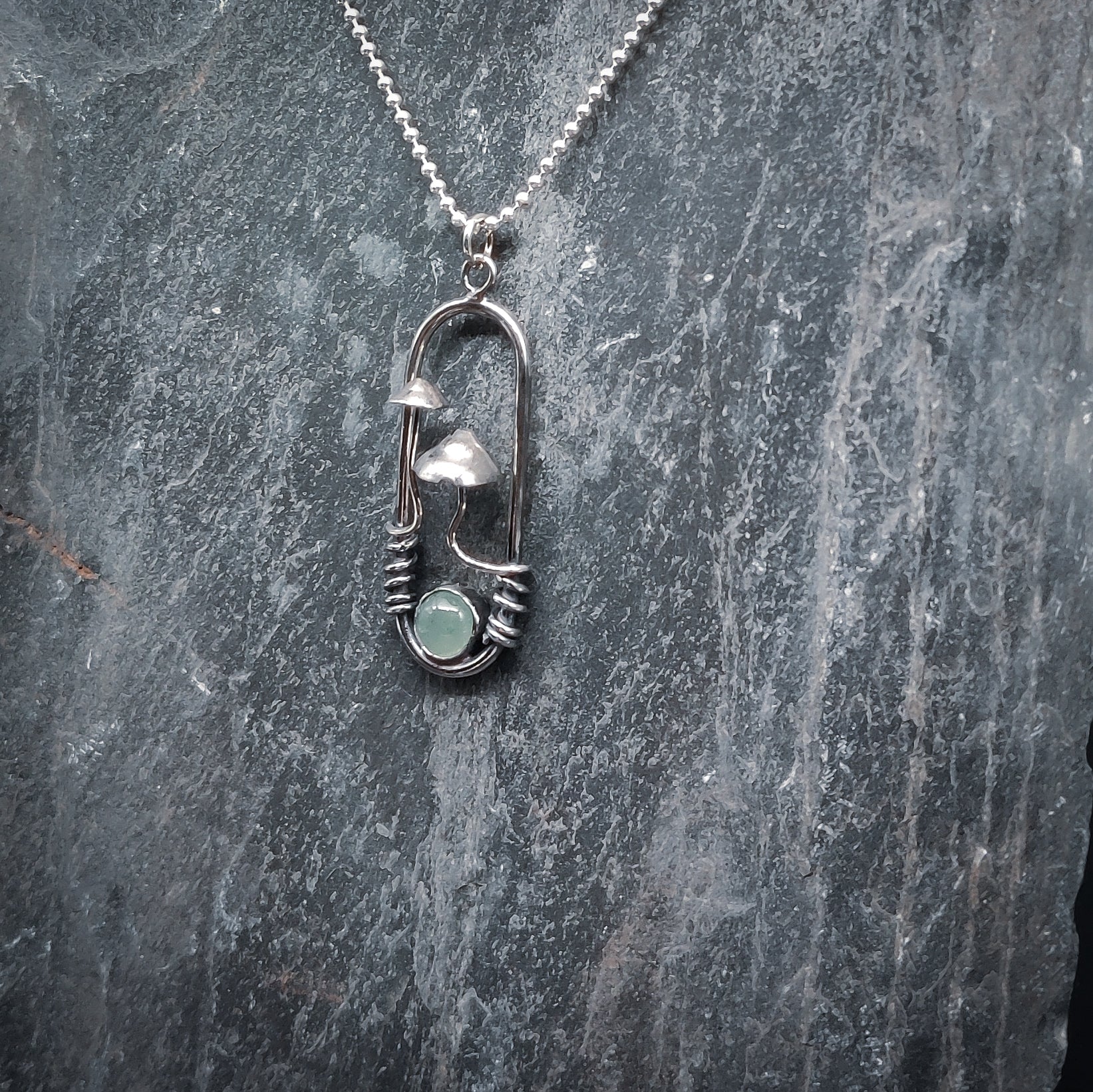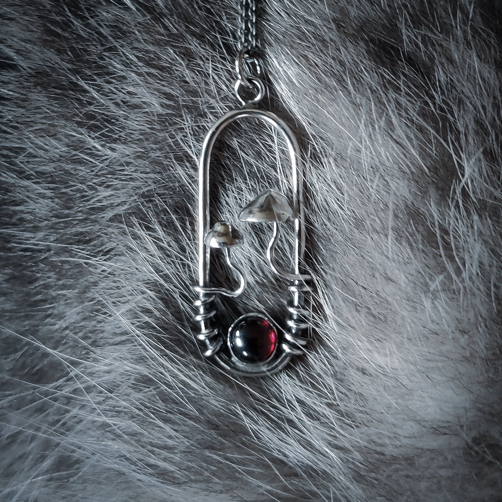 Handgjort halsband i äkta 925 sterlingsilver med avlångt hänge där två skulpterade svampar växer upp ur ramen. Vid basen sitter en infattad ädelsten som ger smycket sin unika karaktär.