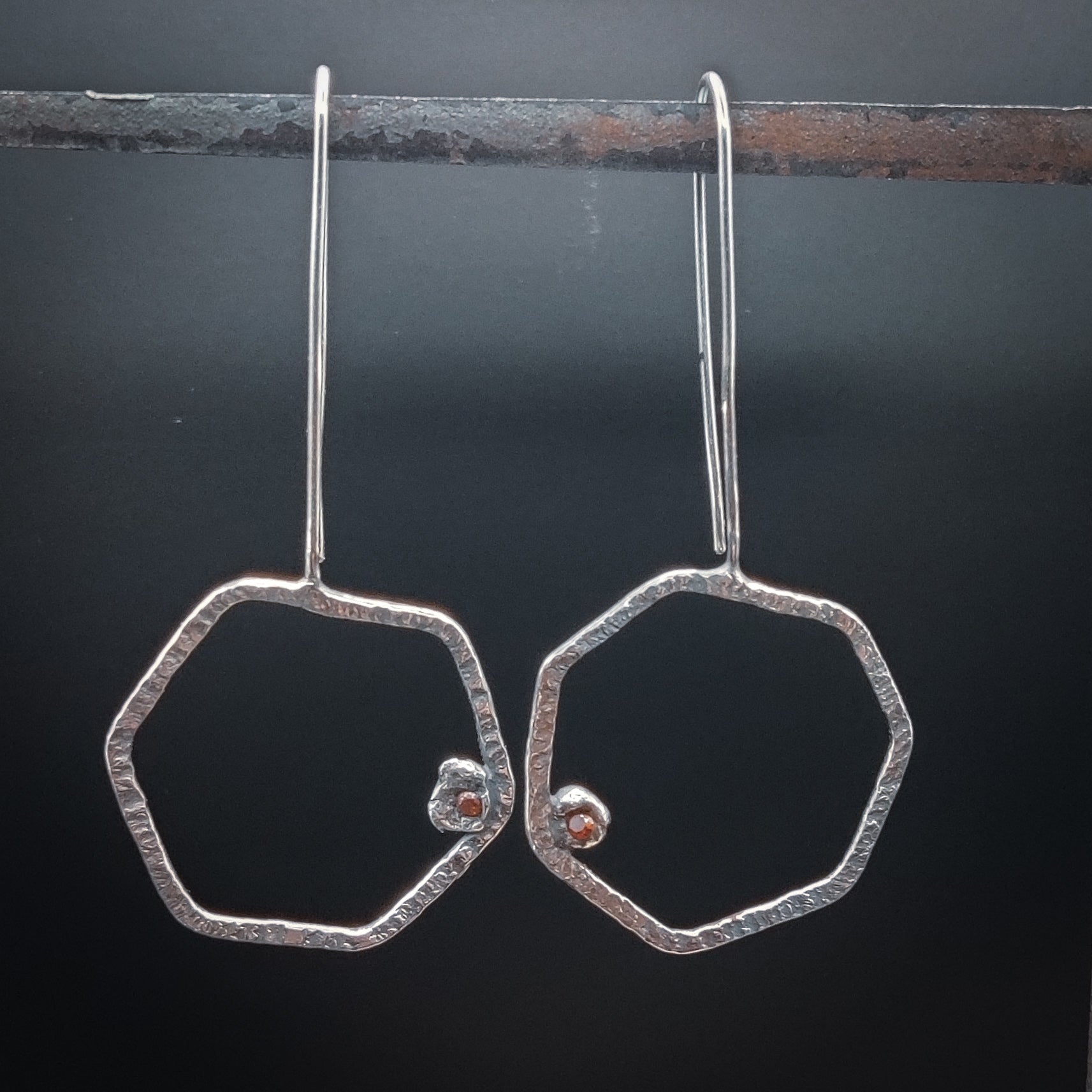 Handgjorda örhängen i äkta 925 sterlingsilver med oktagonformade ramar och texturerad hamrad yta. Varje örhänge har en liten infattad rodolit som ger smycket en subtil färgaccent. Långa, eleganta krokar ger en modern och luftig känsla.