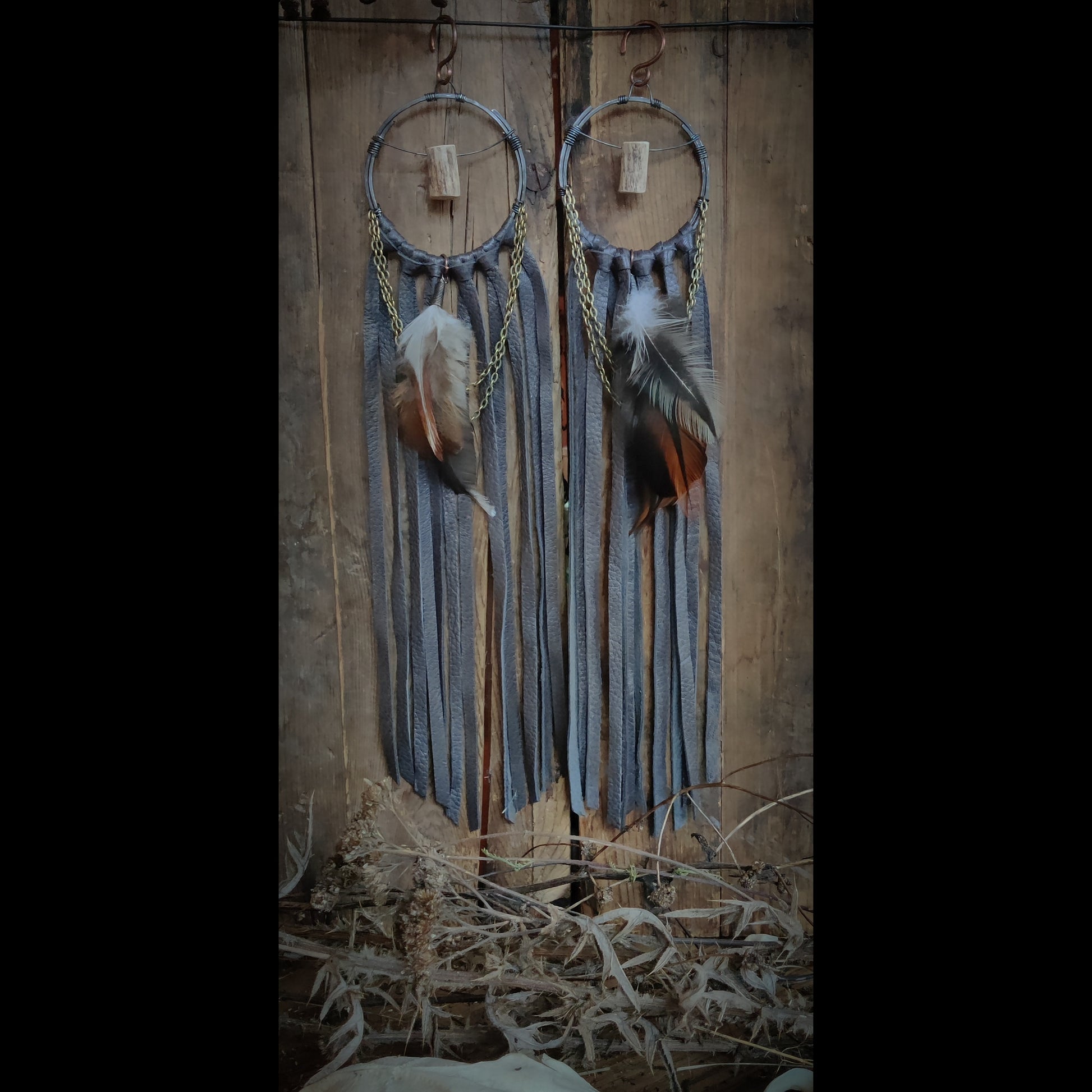 Handgjorda statementörhängen skapade för dig som vill bära något mer än bara smycken. Större ring i stål där centrum pryds av bitar av revben. Från ringen faller långa, mjuka läderband i grå toner, kompletterade med kedjedetaljer och naturliga fjädrar.