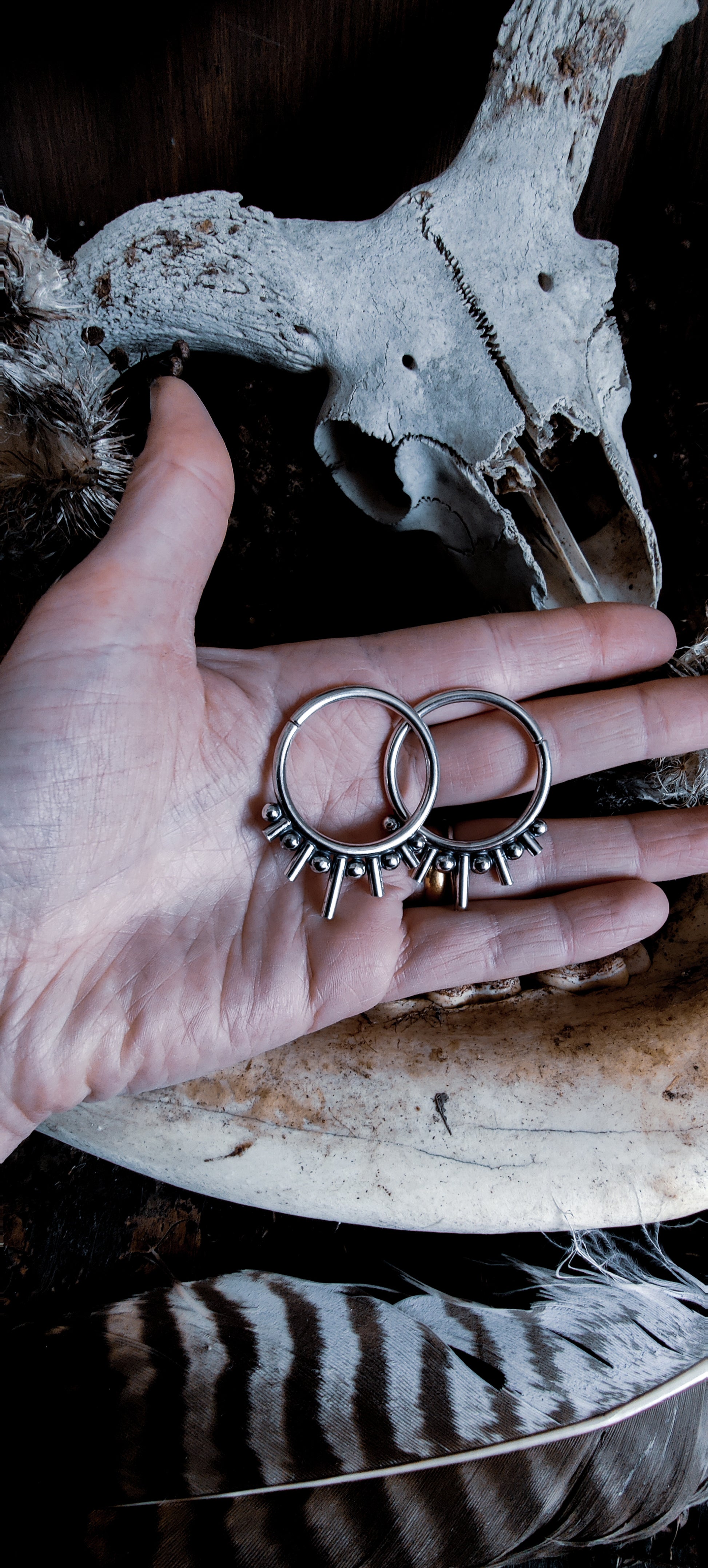 Handgjorda ear weights i massivt 925 sterlingsilver med cirkulär form och markerade stavar i symmetrisk design. Ger en rå men balanserad känsla med tydlig karaktär. Du behöver minst 3 mm hål i öronen för dessa.