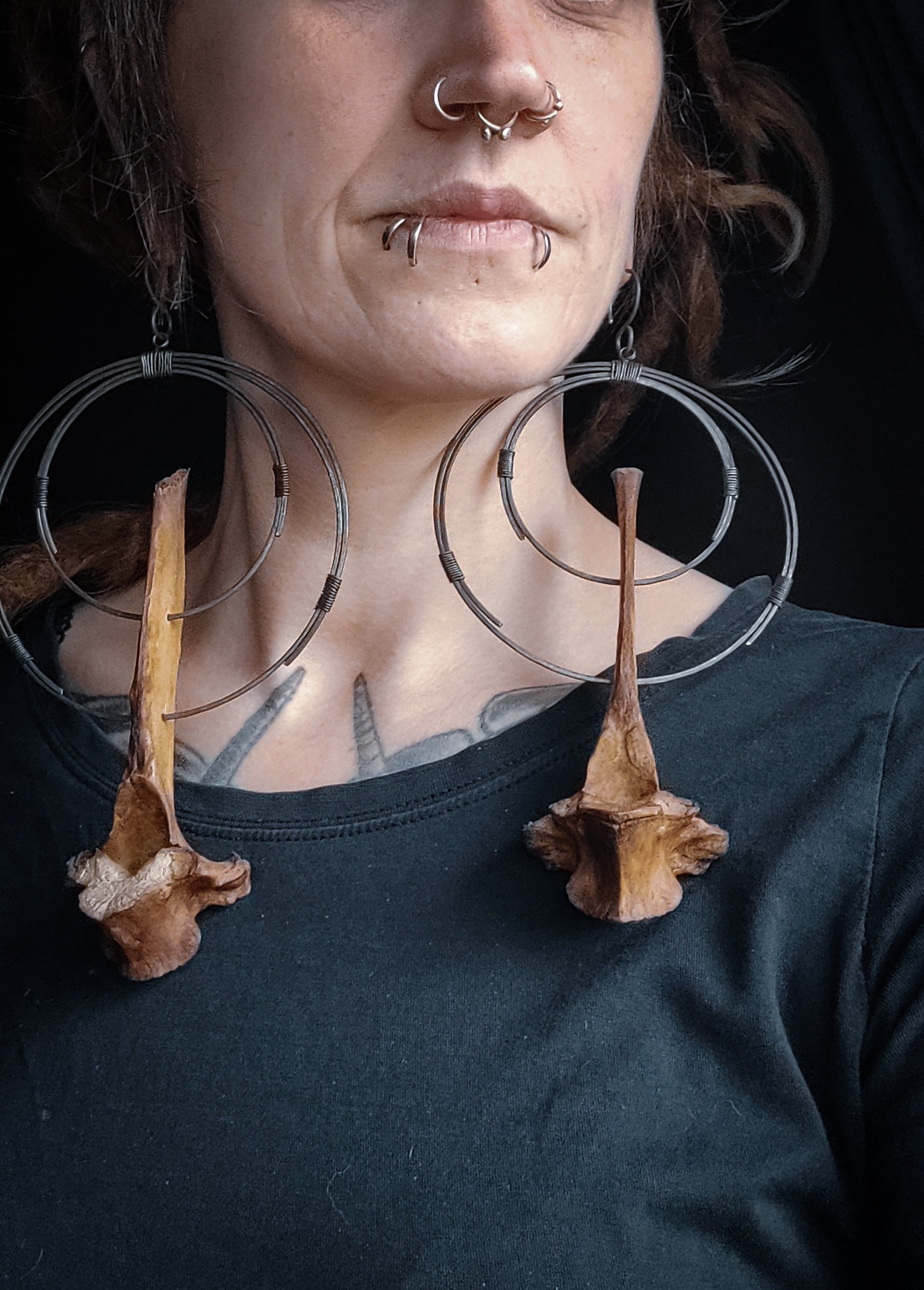 Ear weights med rostfritt stål och naturliga ryggkotor från rådjur. De dubbla cirklarna skapar en geometrisk ram, medan benets organiska form ger smycket en rå och ceremoniell karaktär.