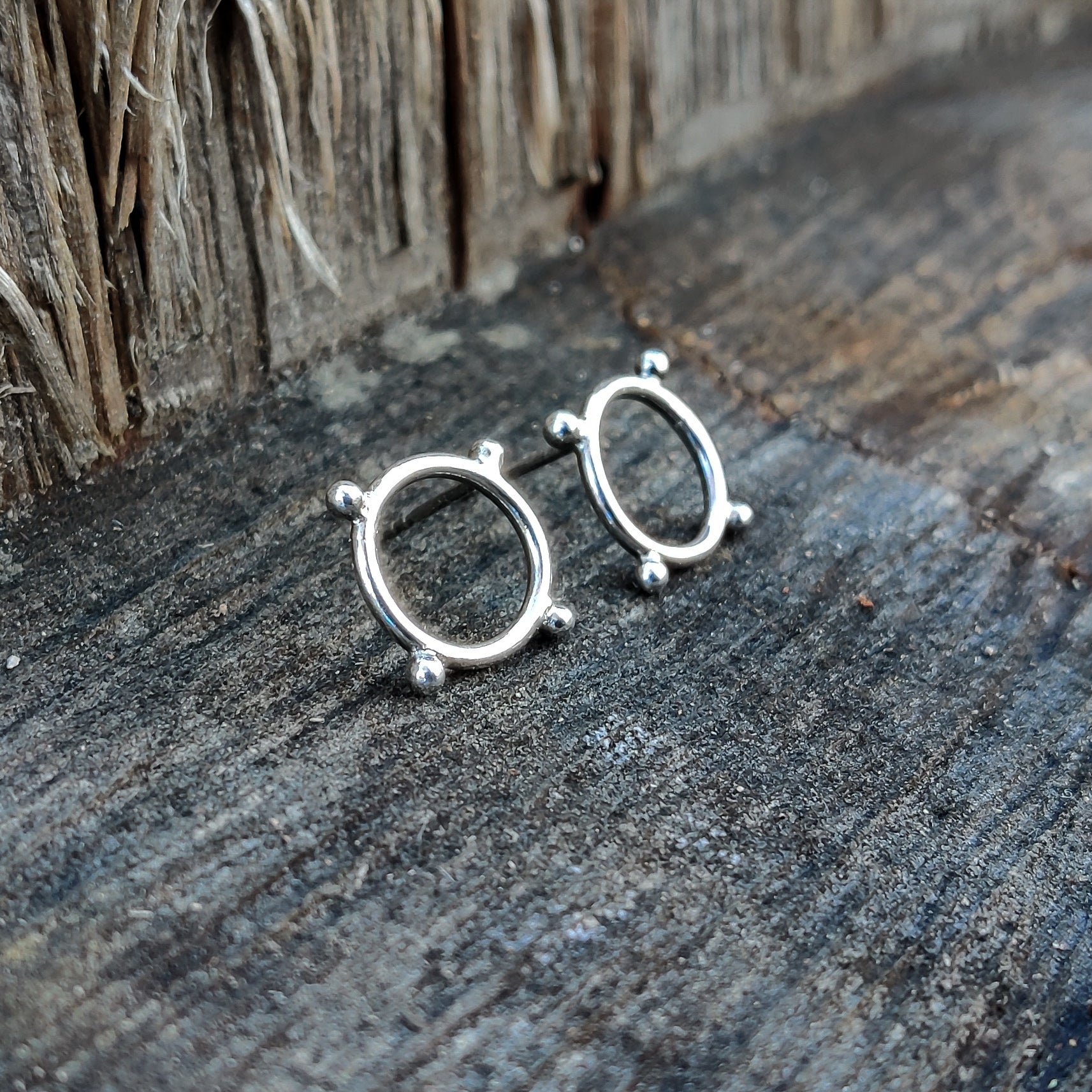 Handgjorda örhängen i äkta 925 sterlingsilver med öppen cirkelform dekorerad med fyra små kuldetaljer. Designen kombinerar enkel geometri med subtila organiska inslag för ett rent men karaktärsfullt uttryck.