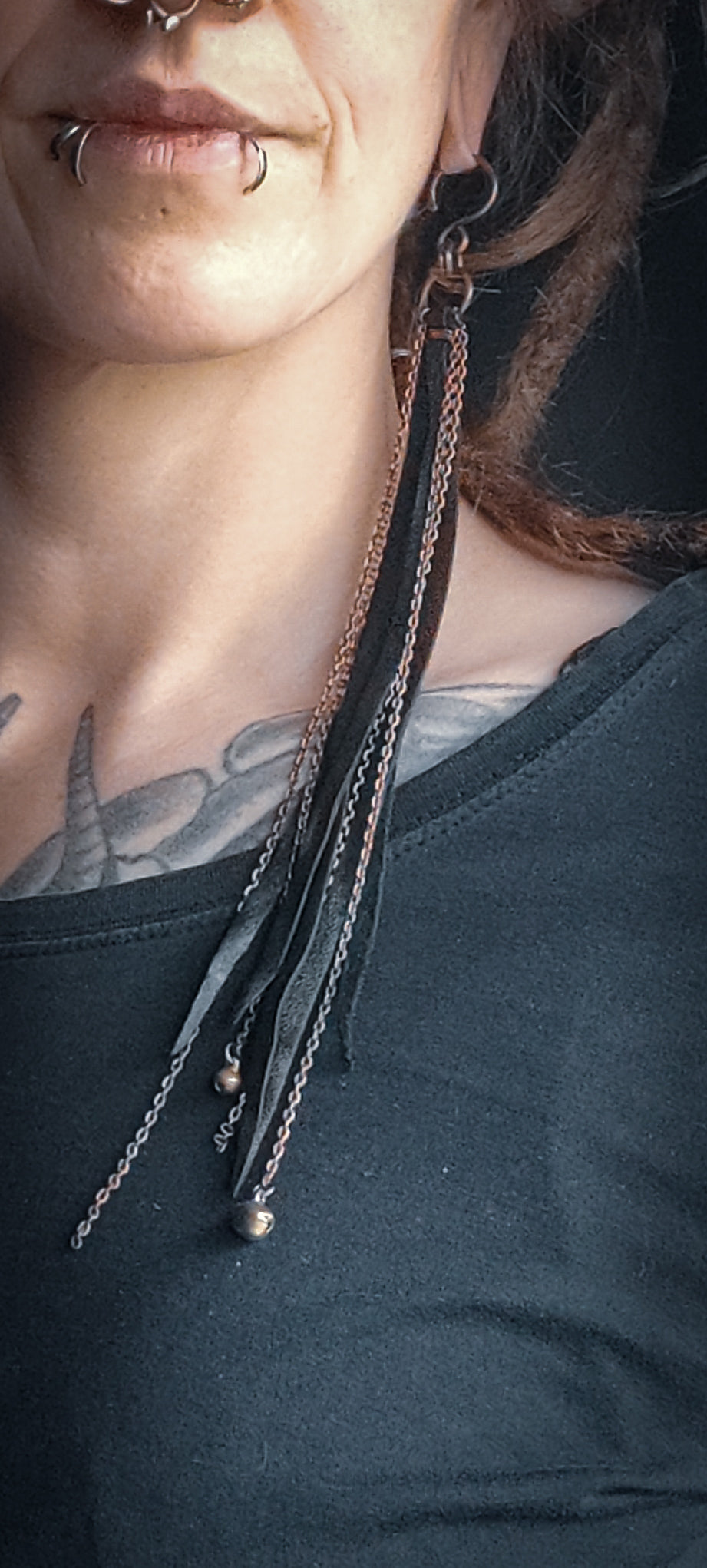 Dramatiska örhängen som förenar ljud och rörelse i en vacker harmoni. Flera kedjor i koppar och oxiderat stål faller graciöst från örat, dekorerade med bjällror som skapar ett mjukt klingande när du rör dig. Läderdetaljer ger en rå och naturlig touch till den eleganta designen.