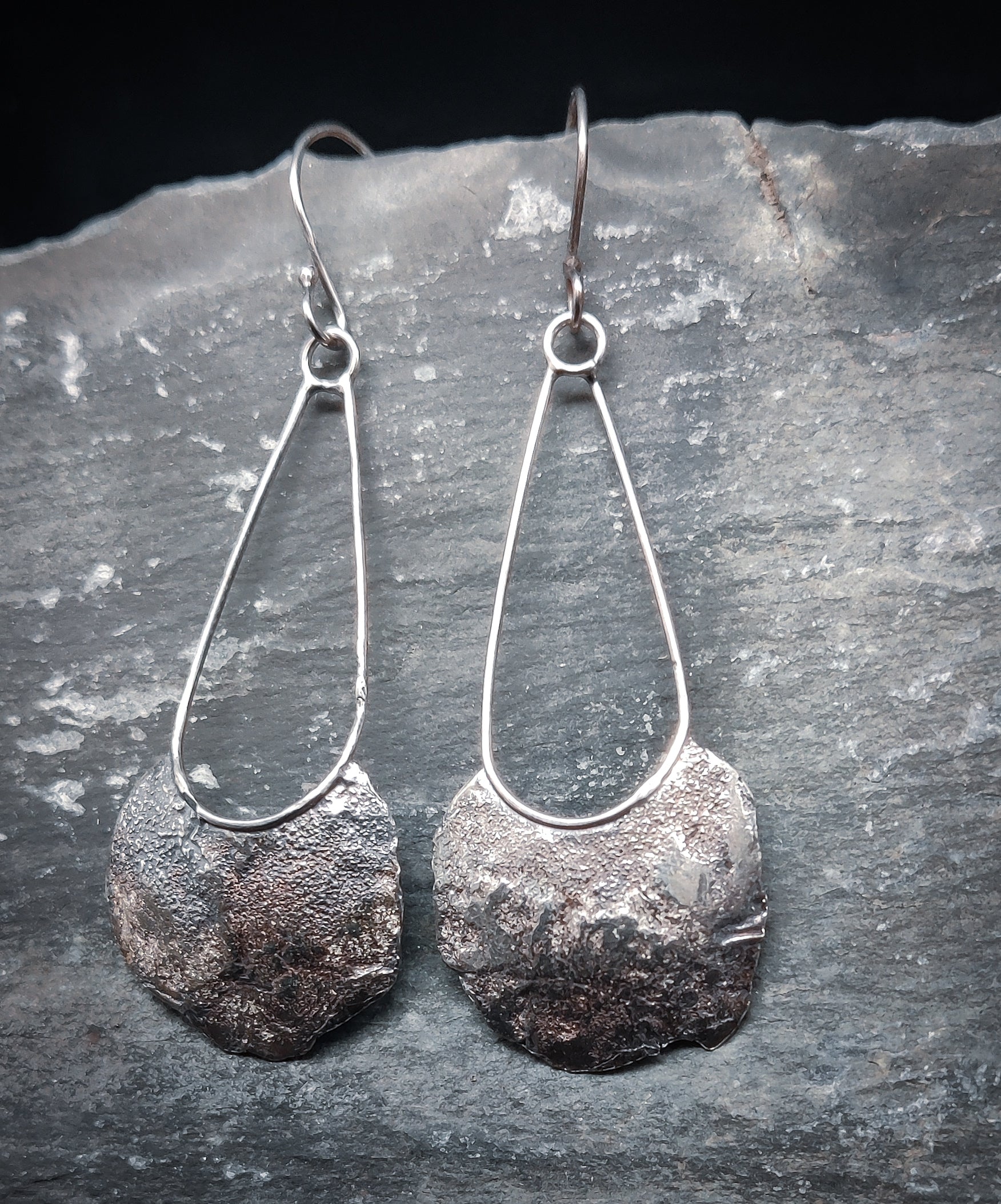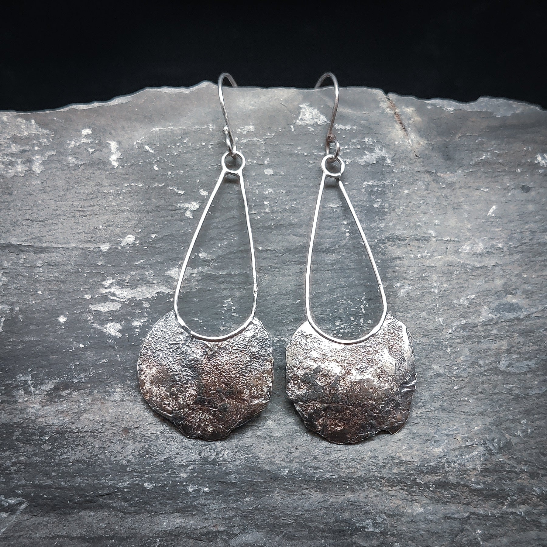 Handgjorda örhängen i äkta 925 sterlingsilver med avlång, droppformad design. Den nedre delen har en organisk, texturerad yta som kontrasterar mot den släta, polerade ramen. Varje örhänge är unikt format med en rå och jordnära karaktär.