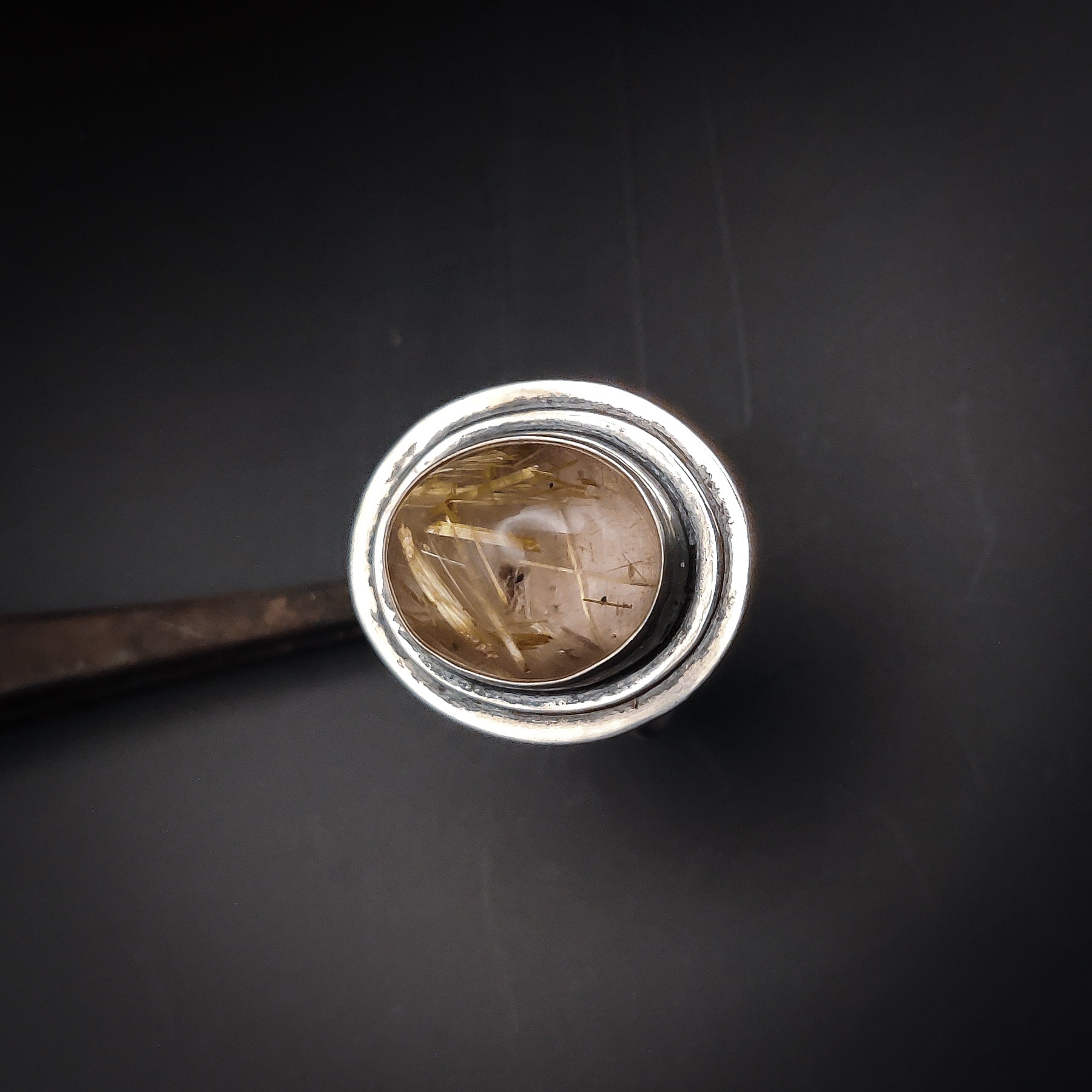 Detta är ett unikt smycke skapat som en enstaka design. Guldrutil med sina gyllene nålar är en sällsynt och vacker sten som gör ringen helt personlig.