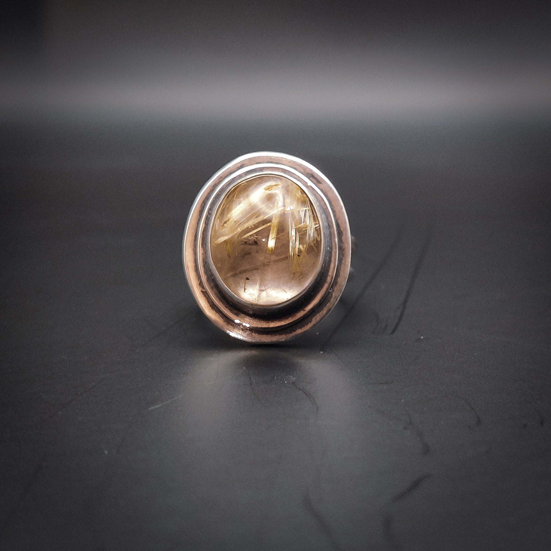 Unik handgjord ring i massivt 925 sterlingsilver med facetterad guldrutil. Den eleganta fattningen med dubbla silverband lyfter fram stenens gyllene nålar och naturliga skönhet. Ringen är justerbar i storlek för perfekt passform. Detta är ett unikt smycke - endast denna ring finns i denna design.